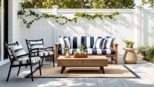 Striped patio furniture brings a timeless nautical charm that works whether you’re steps from the shore or landlocked in the